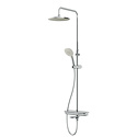 Устройство: душевая система • Смеситель: термостатический • Ручная лейка: размер 120 мм, настройки 3 шт • Верхний душ: размер 250 мм, настройки 1 шт • Комплектация: ручной душ, смеситель, стойка, шланг, крепление ручного душа, полка
