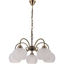 Подвесная люстра стиля модерн для гостиной, кабинета или спальни имеет размеры 600х950 мм. Арматура светильника окрашена в бронзовый цвет. Лампы в комплекте - отсутствуют. В светильнике применяются лампы накаливания или светодиодная LED-лампа. Цвет плафонов - белый с рисунком, с матовой поверхностью. Материал плафонов - стекло. Класс электробезопасности - I, степень пылевлагозащиты (IP) - 20. Максимальная мощность лампы (Вт) - 60. Светильник размещается на потолоке.