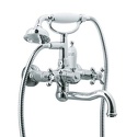 Назначение: ванна+душ • Конструкция: двухрычажный • Монтаж: вертикальный • Материал: покрытие - хром • Подводка: жесткая • Монтажные отверстия: 2 отверстия • Форма излива: традиционная • Душевая лейка в комплекте: есть • Держатель для душевой лейки: на смесителе