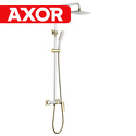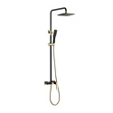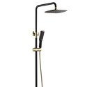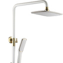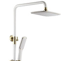 Устройство: душевая система • Смеситель: джойстик • Ручной душ (душевая лейка): настройки 1 шт • Верхний душ (тропический): размер 250 мм, настройки 1 шт • Комплектация: ручной душ, верхний душ, смеситель, стойка, шланг, крепление ручного душа • Покрытие: под золото