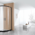 Форма четверть круга. Раздвижные двери. Профиль из нержавеющей стали с покрытием черного цвета. Ширина входа 78 см.