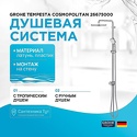 Устройство: душевая система • Смеситель: джойстик • Ручной душ (душевая лейка): размер 100 мм, настройки 4 шт • Верхний душ (тропический): размер 250 мм, настройки 1 шт • Комплектация: ручной душ, верхний душ, смеситель, стойка, шланг, крепление ручного душа
