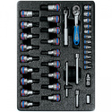 Комплектация- Головка торцевая стандартная шестигранная 1/4", KING TONY серии 2335M: 4, 4.5, 5, 5.5, 6, 7, 8, 9, 10, 11, 12, 13- Насадка (бита) торцевая 1/2", TORX, L = 60 мм KING TONY серии 4023: 20, 25, 27, 30, 40, 45, 50, 55, 60- Насадка (бита) торцевая 1/2", HEX, L = 60 мм KING TONY серии 4025: 3, 4, 5, 6, 7, 8, 10, 12, 14- Кардан 1/4" KING TONY 2792- Держатель вставок (бит) 1/4">1/4" KING TONY 2141- Трещотка 1/4", 140 мм, 24 зубца, флажковая, фиксатор KING TONY 2779-55G- Удлинитель 1/4", 100 мм KING TONY 2221-04- Удлинитель 1/4", 50 мм KING TONY 2221-02- Вороток 1/4", 125 мм, с шарниром KING TONY 2452-05F- Вороток 1/4", 115 мм, скользящий KING TONY 2571-45- Ложемент